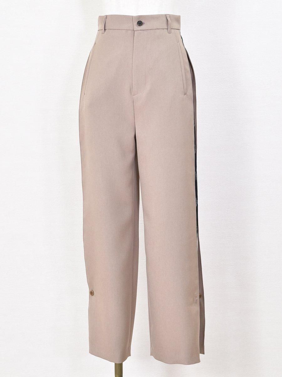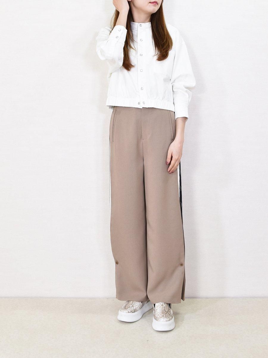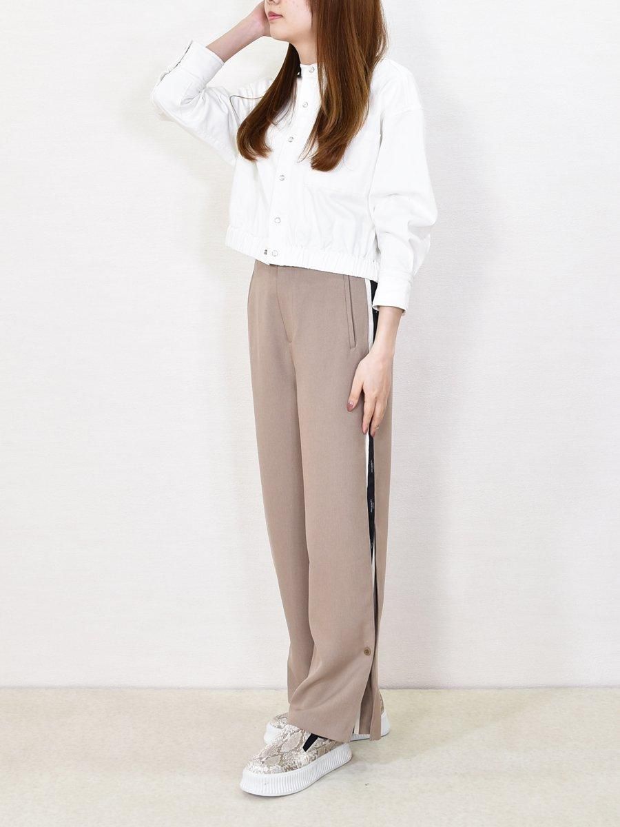裾にボタンが付いていて、外すとサイドラインの縦ラインが強調され脚長効果も。