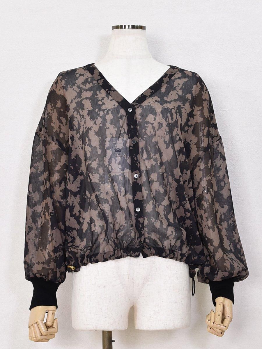 trois (トロワ) Vネック 楊柳プリント ジョーゼットブラウス
