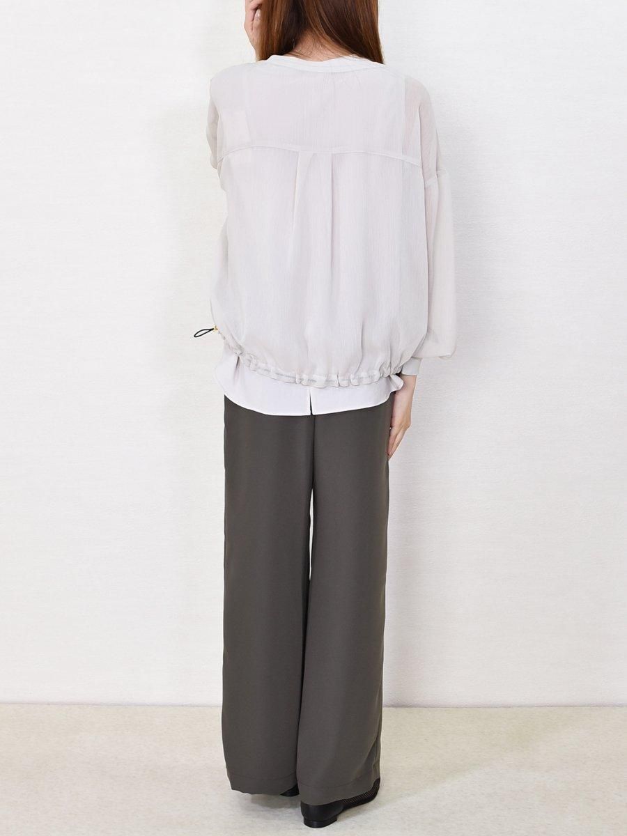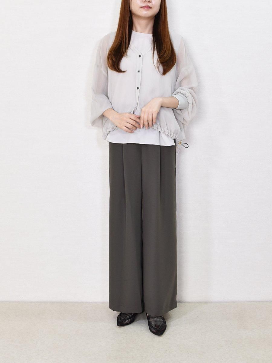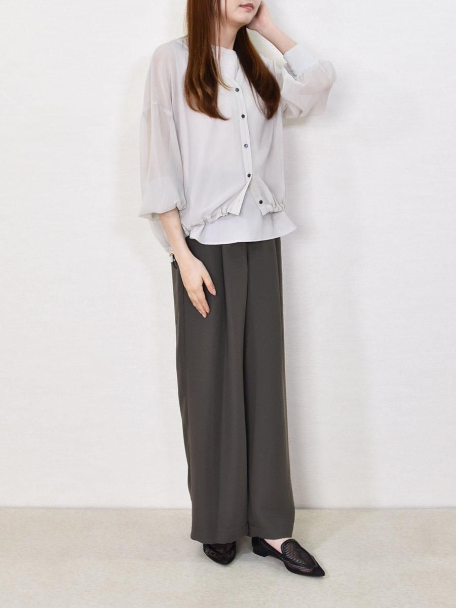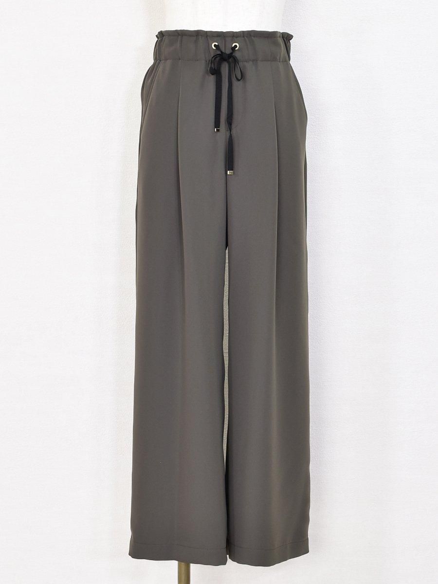 trois(トロワ)のダブルクロスワイドイージーパンツ。軽さと膨らみに加え、綾織りにすることで表面感を出した上品な生地。