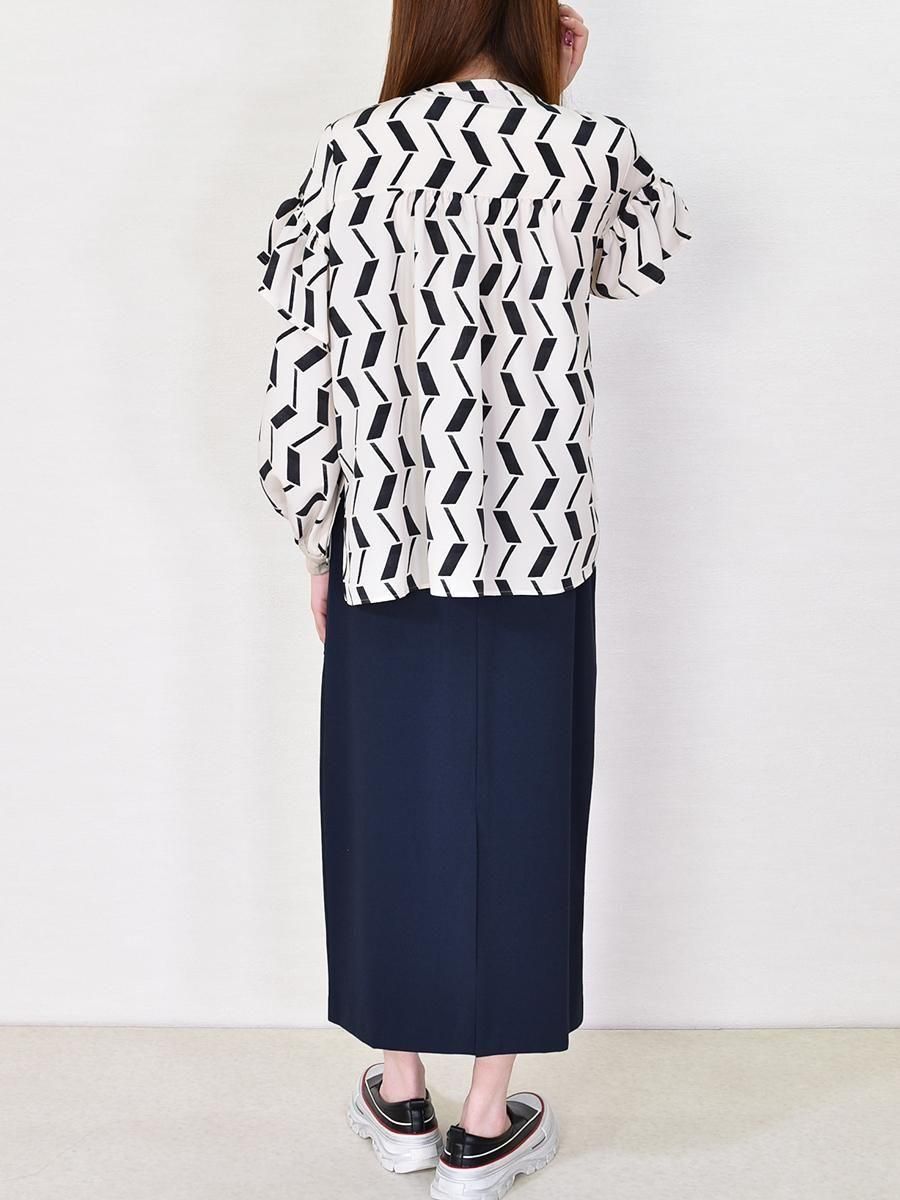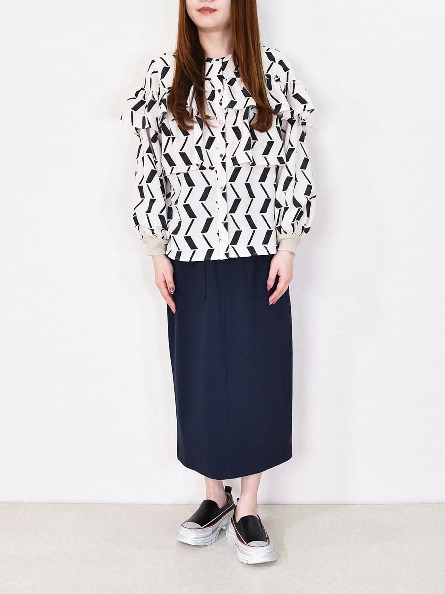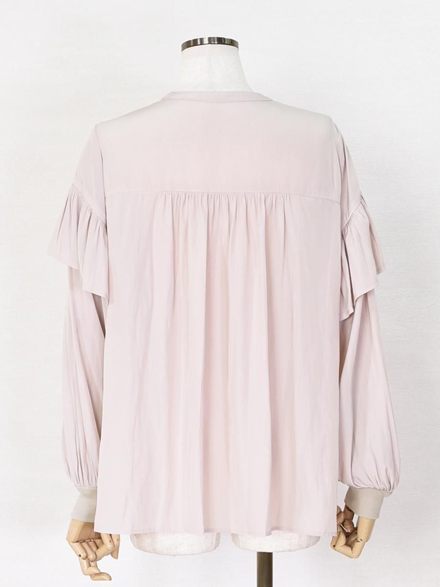 trois(トロワ)のフリルブラウス。シワになりにくいデシン素材を使用。