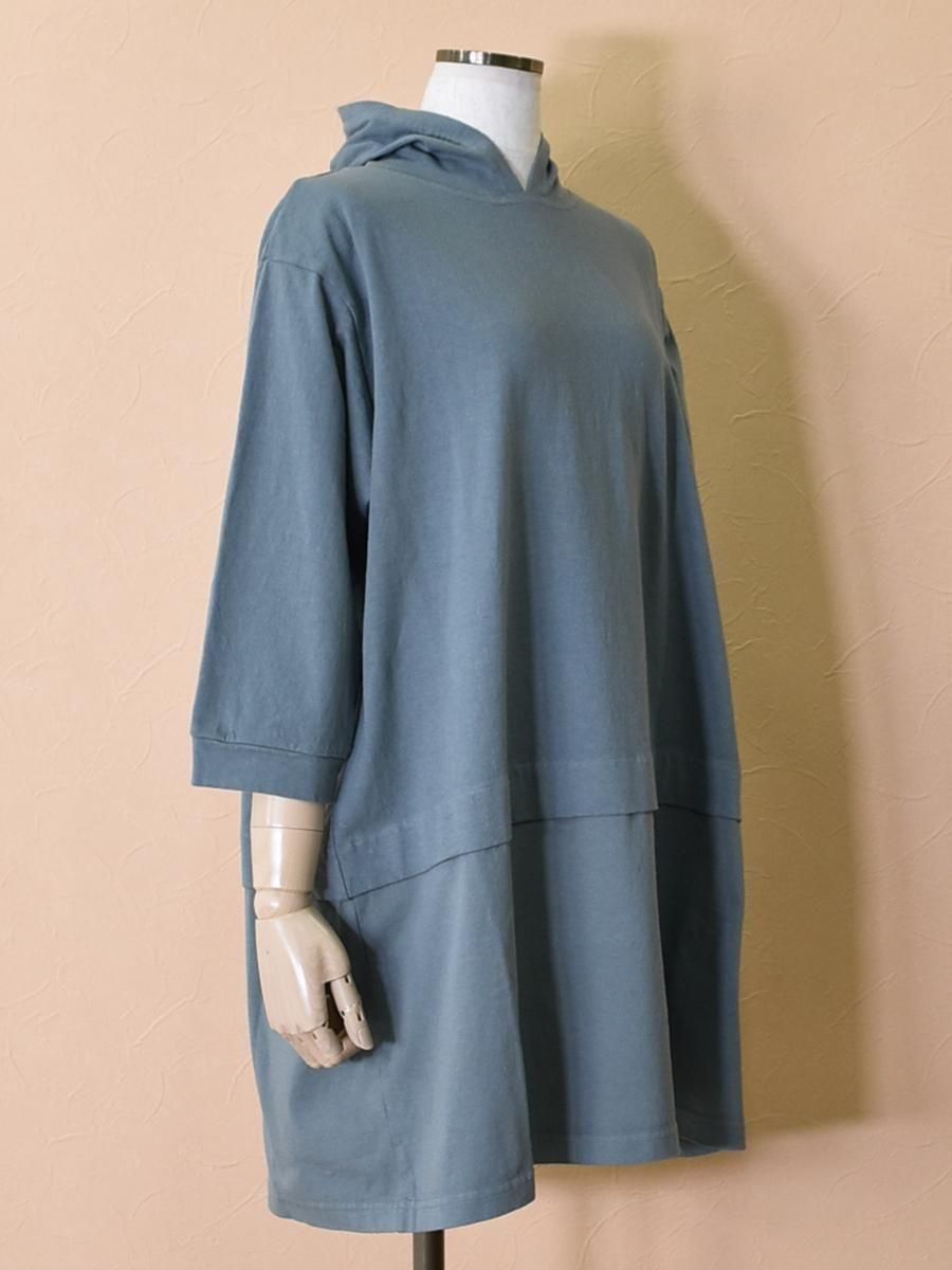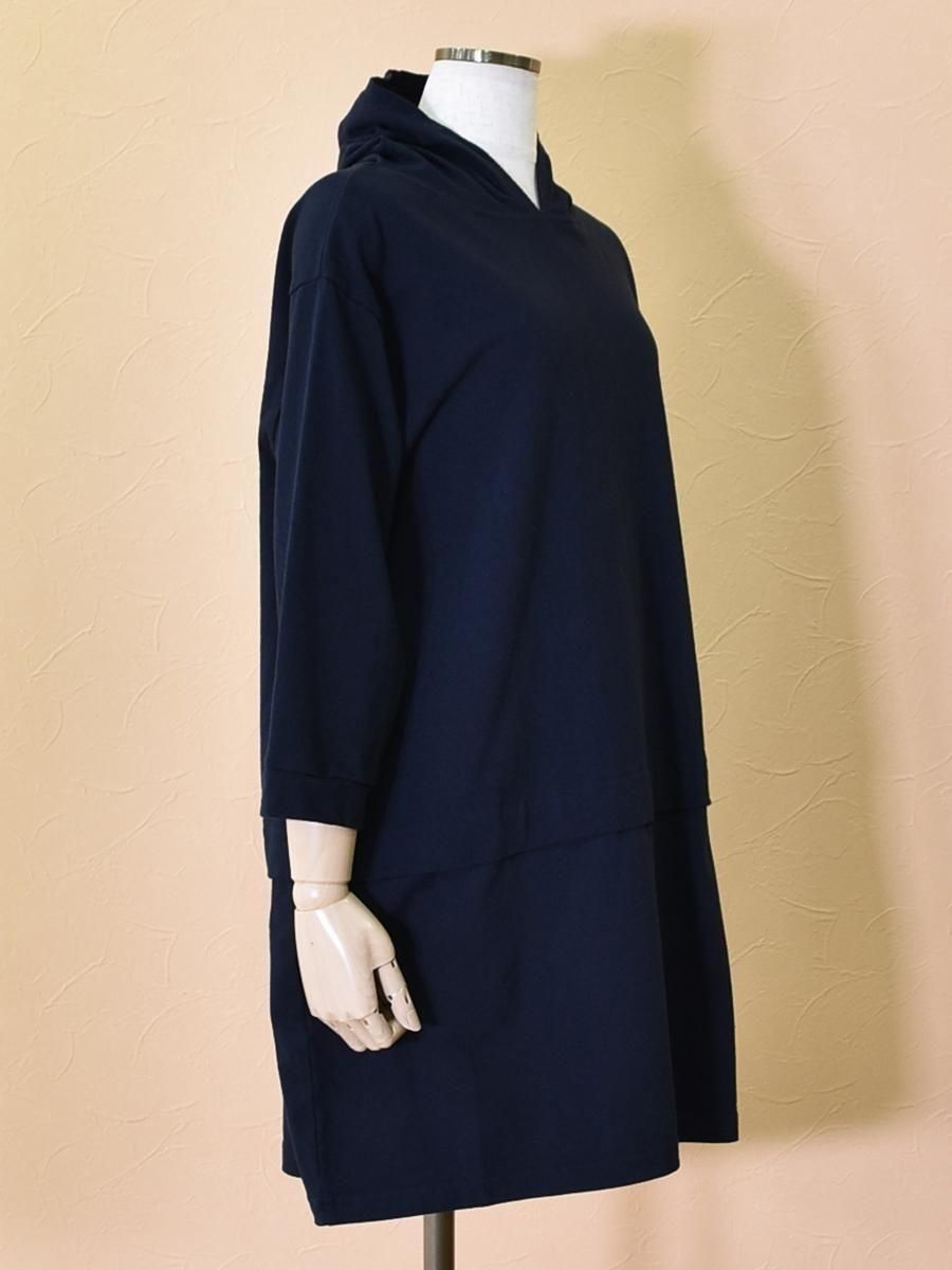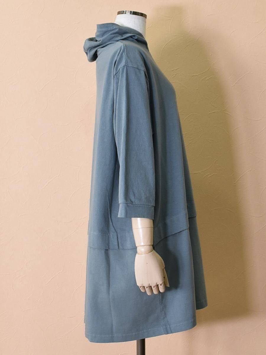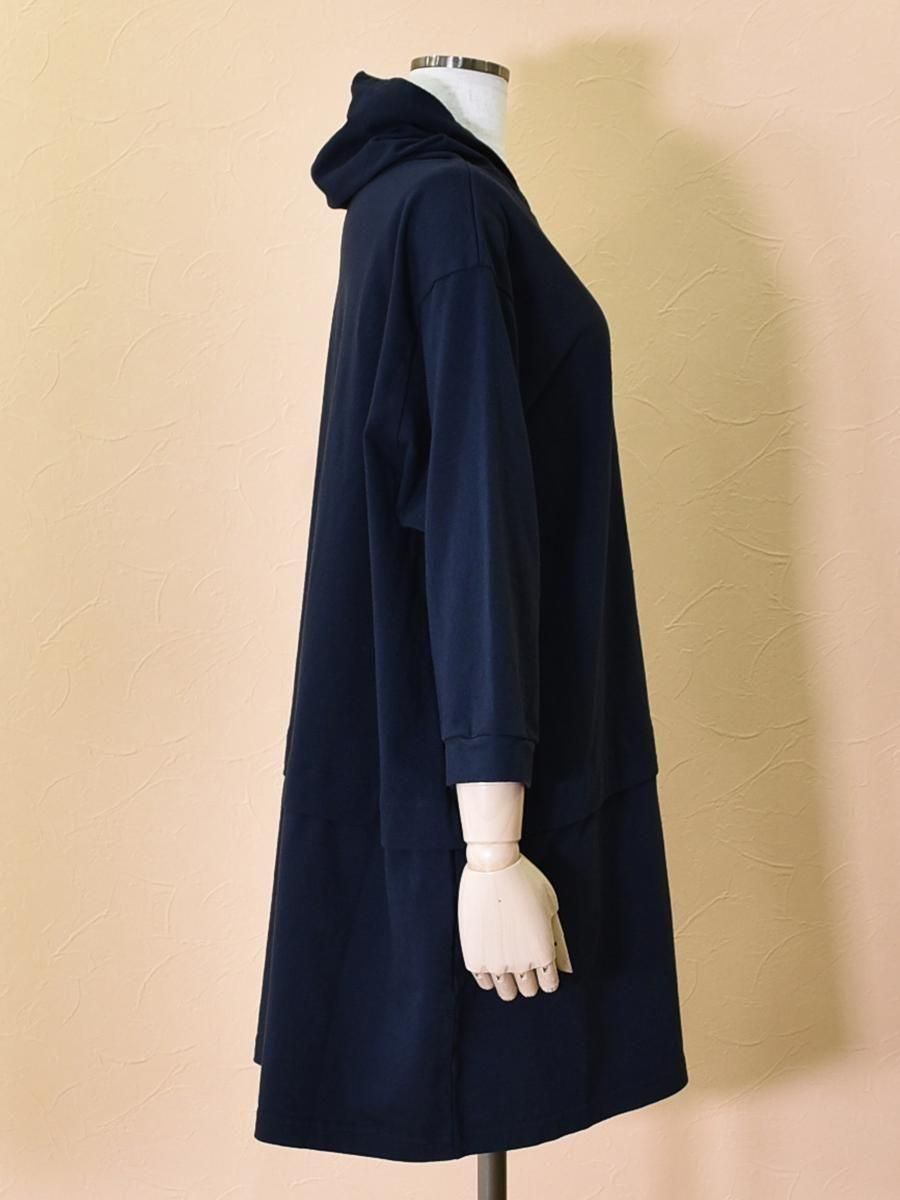 in leaf(インリーフ)の裾切替フード付きワンピース。ゆとりのあるAラインシルエットで、ストレスフリーな着心地です。