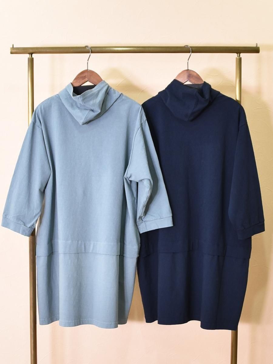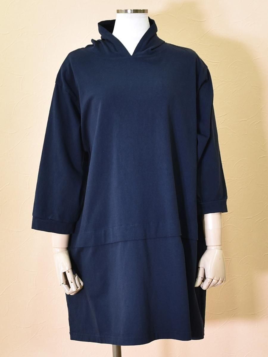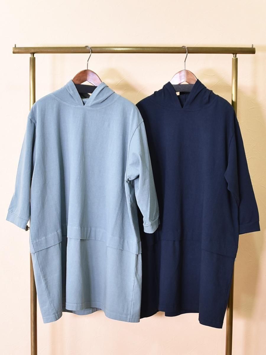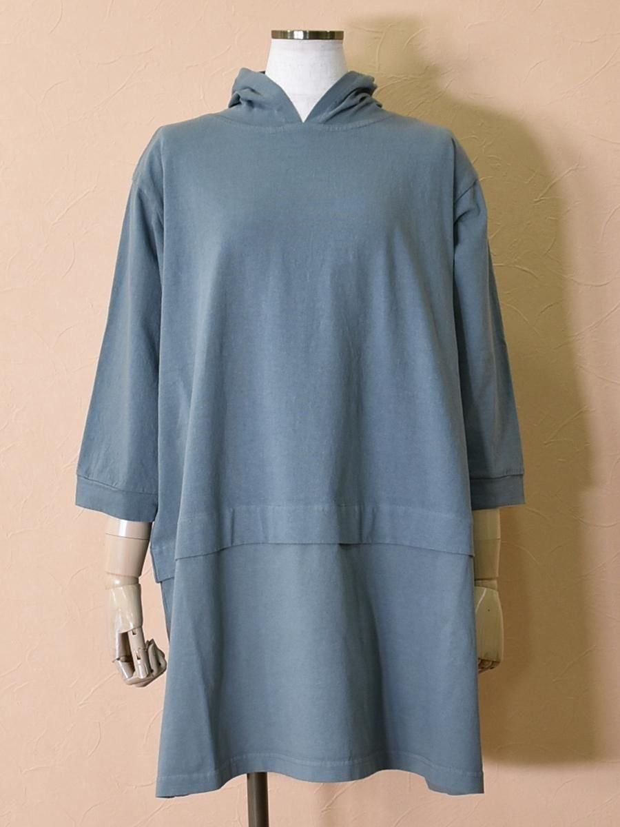 in leaf(インリーフ)の裾切替フード付きワンピース。ゆとりのあるAラインシルエットで、ストレスフリーな着心地です。