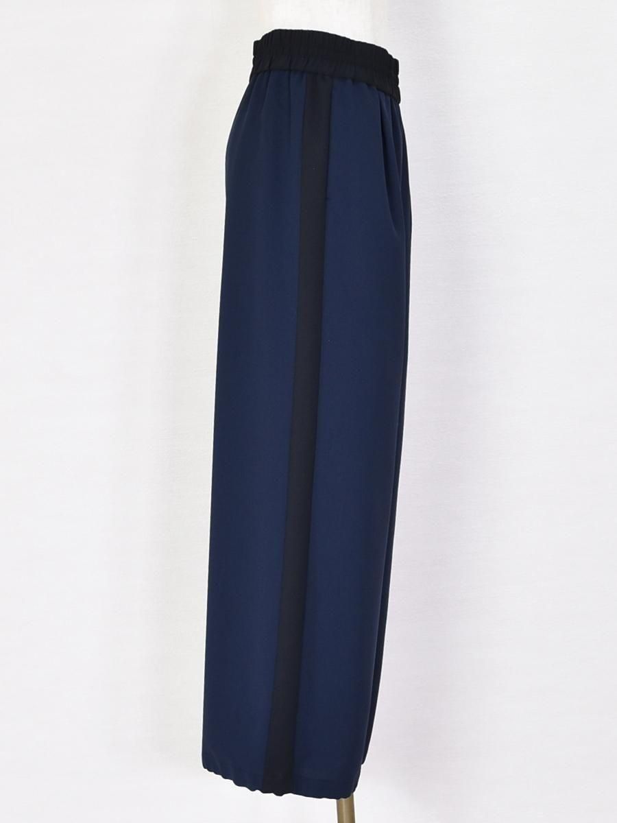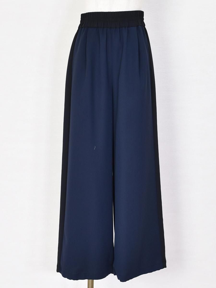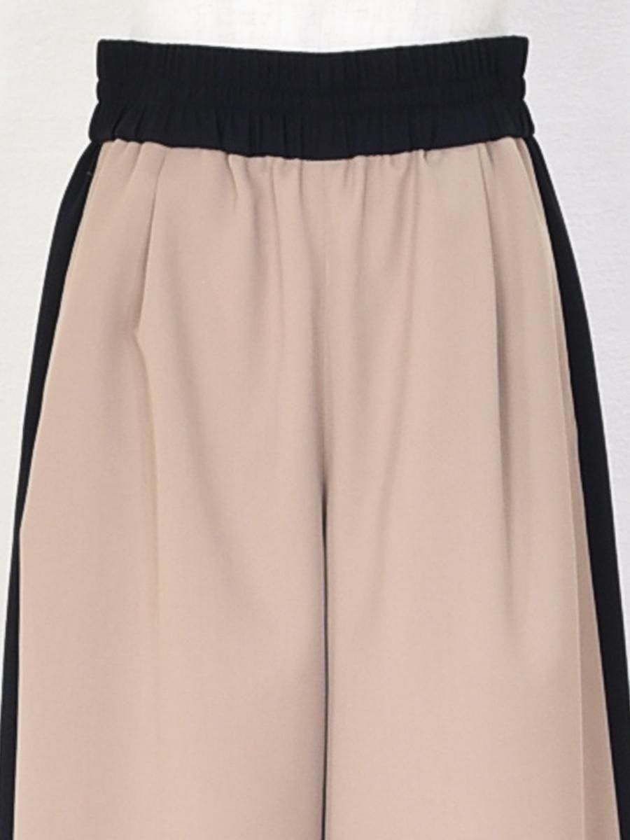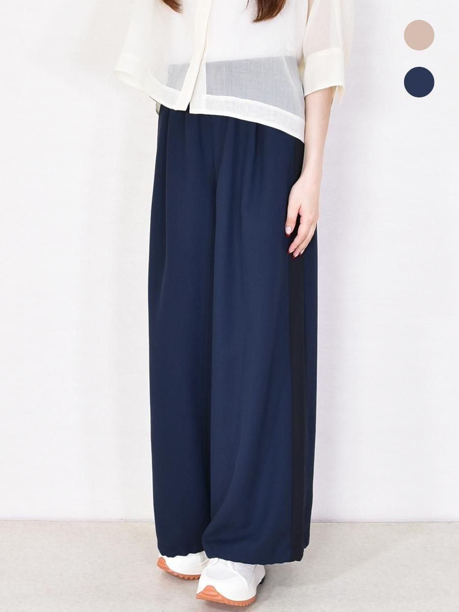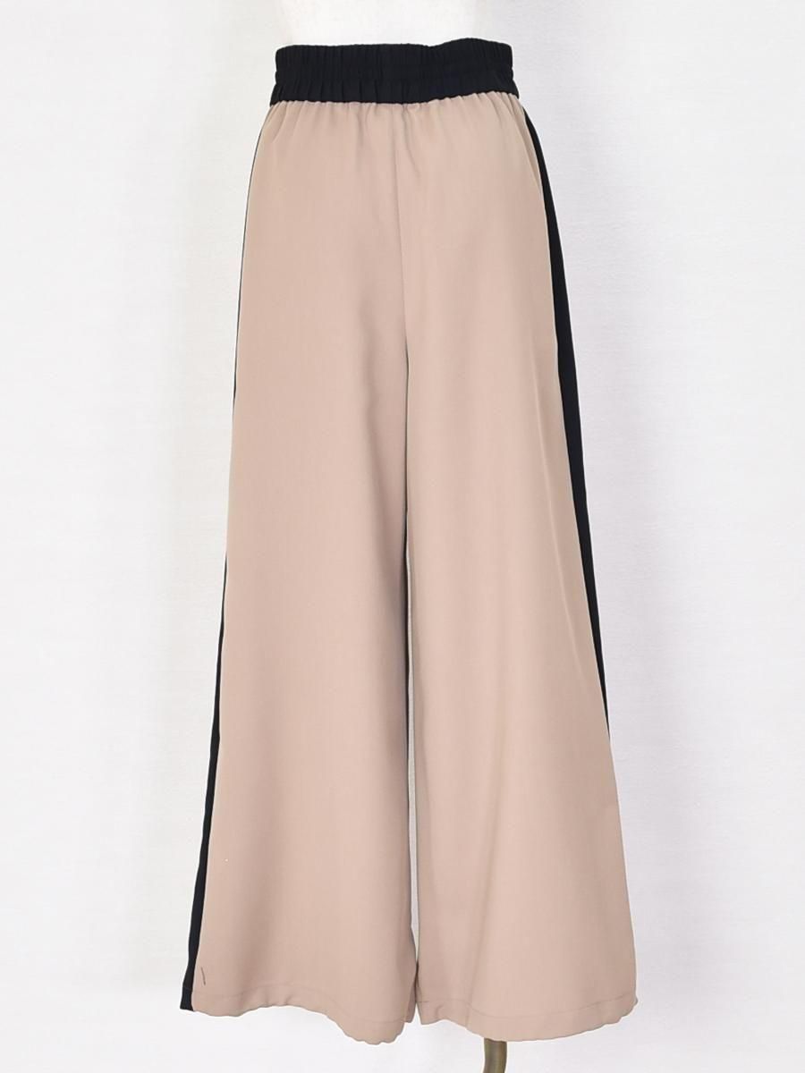 PASSIONE(パシオーネ)のサイドラインワイドパンツ。ウエストゴム仕様で、ブラックの配色サイドラインが効いたデザイン。