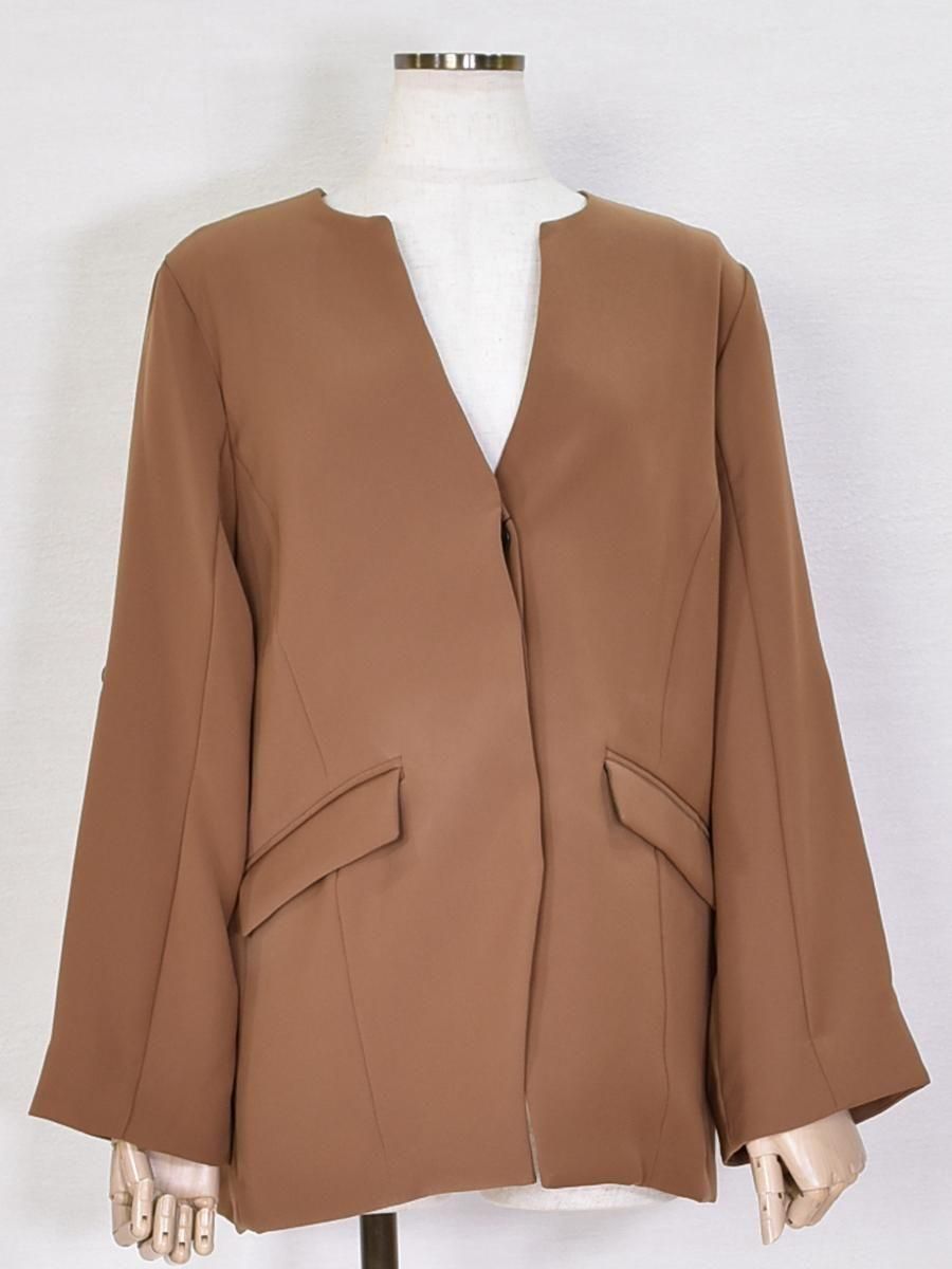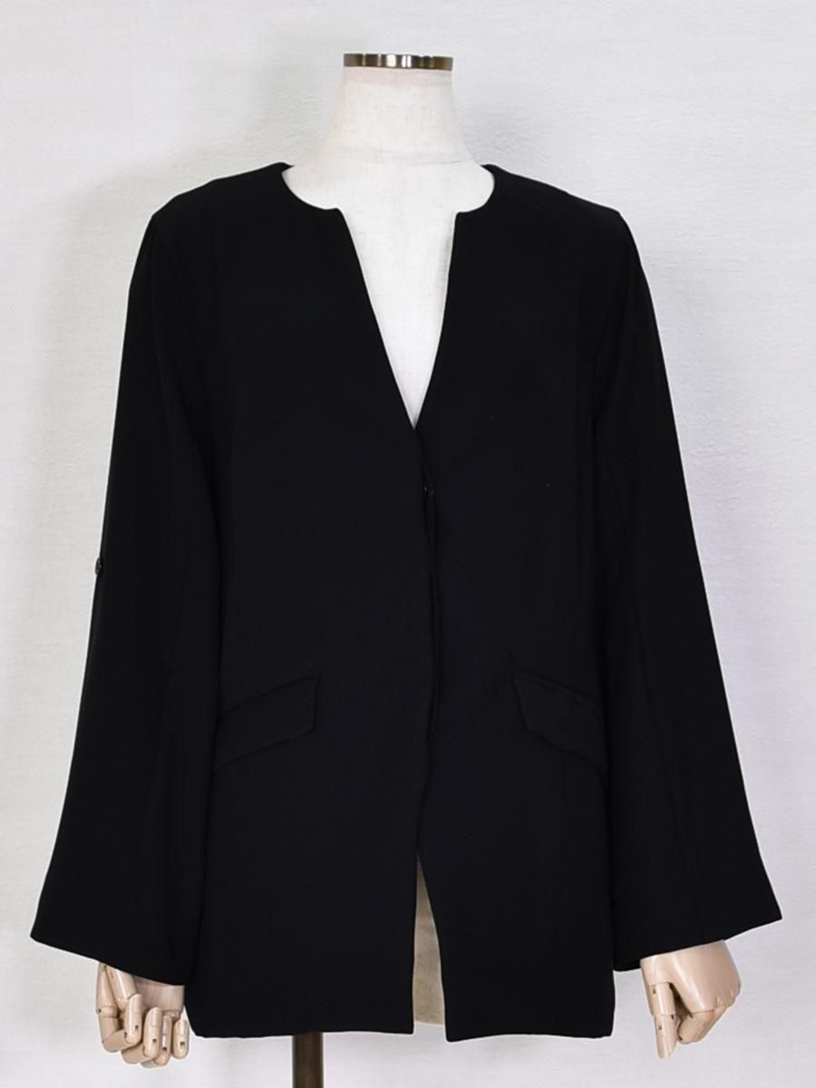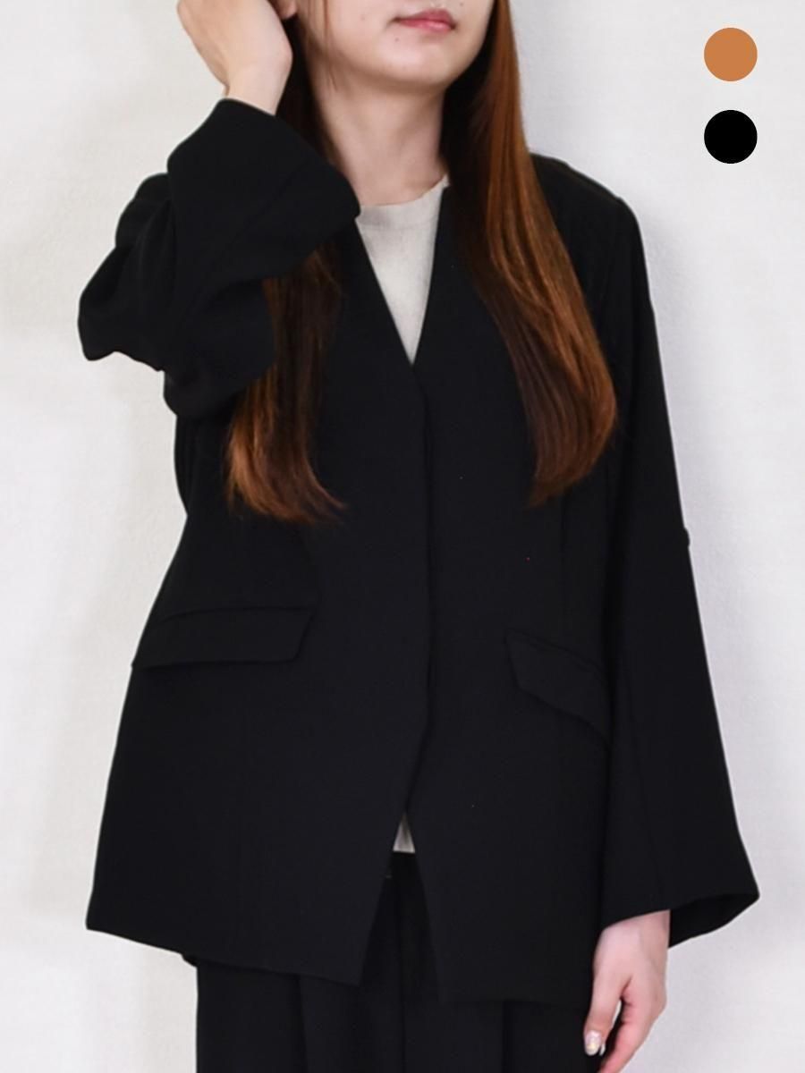 trois(トロワ)のダブルクロスジャケット。フロントはすっきりとした比翼仕立てで、洗練された印象のノーカラージャケット。