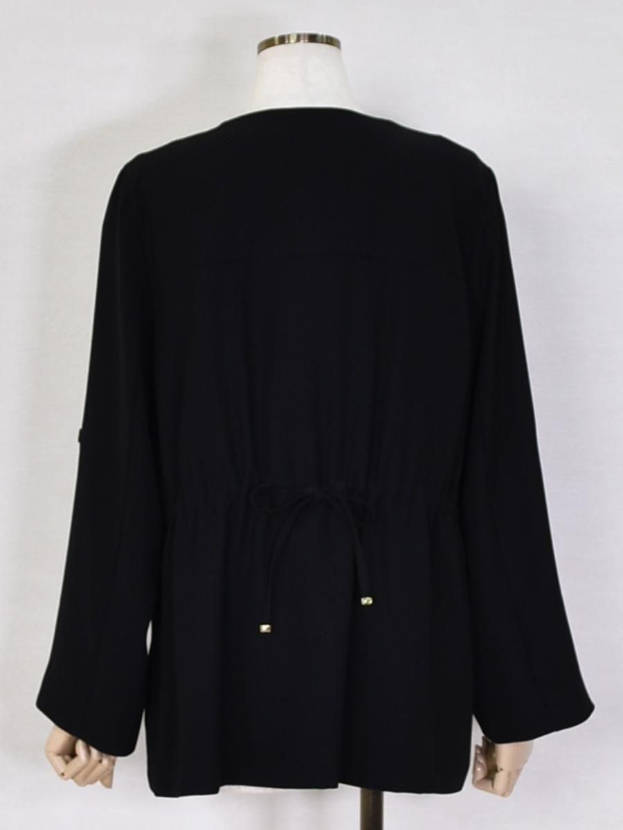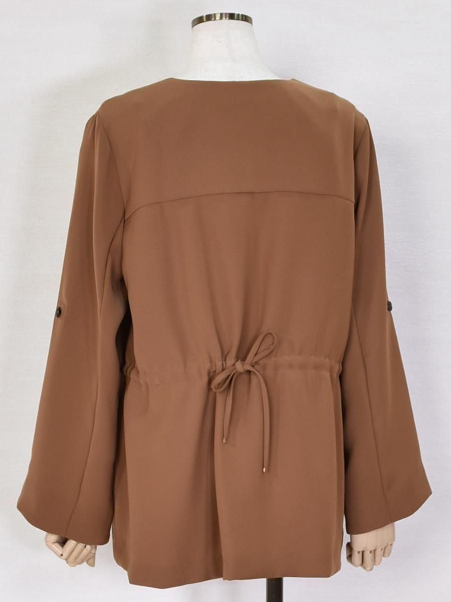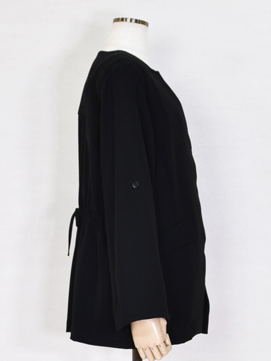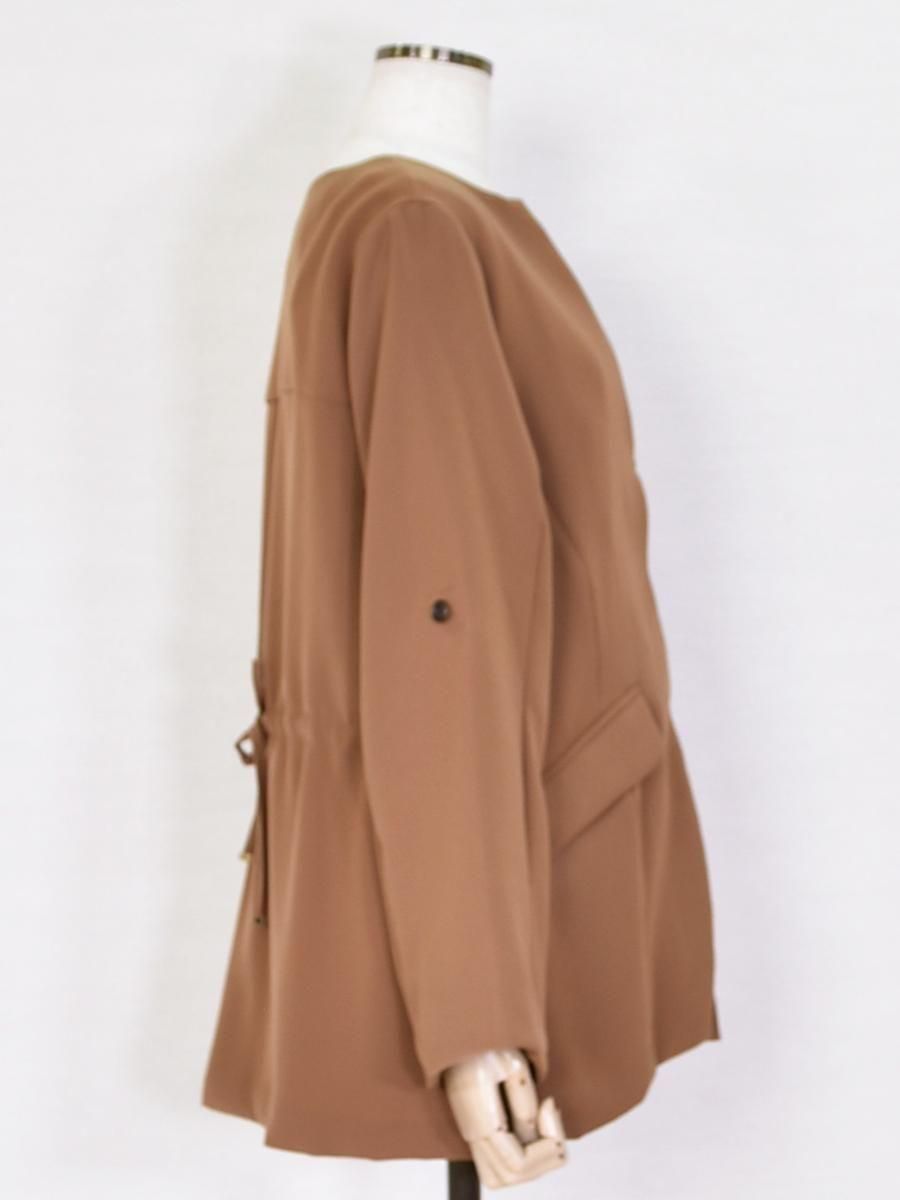 trois(トロワ)のダブルクロスジャケット。フロントはすっきりとした比翼仕立てで、洗練された印象のノーカラージャケット。