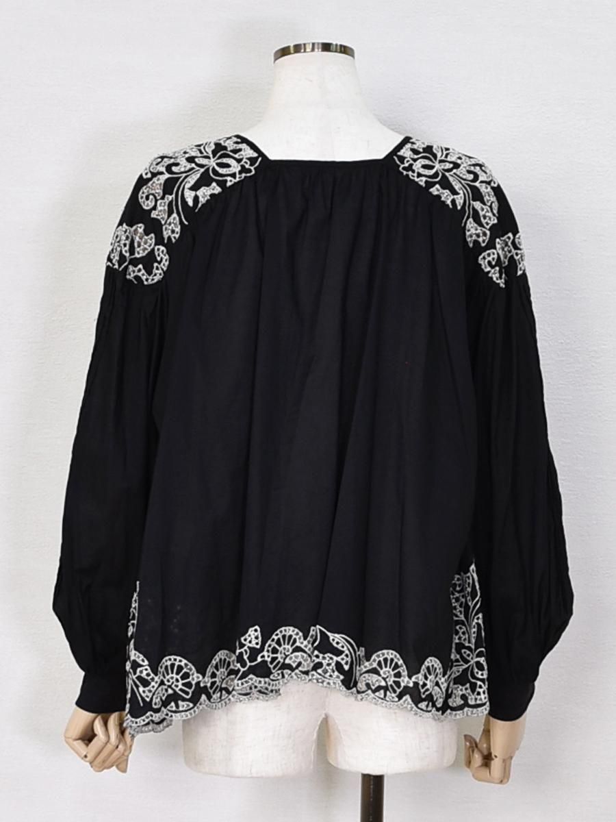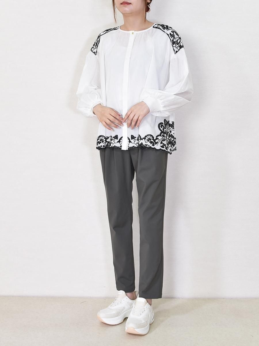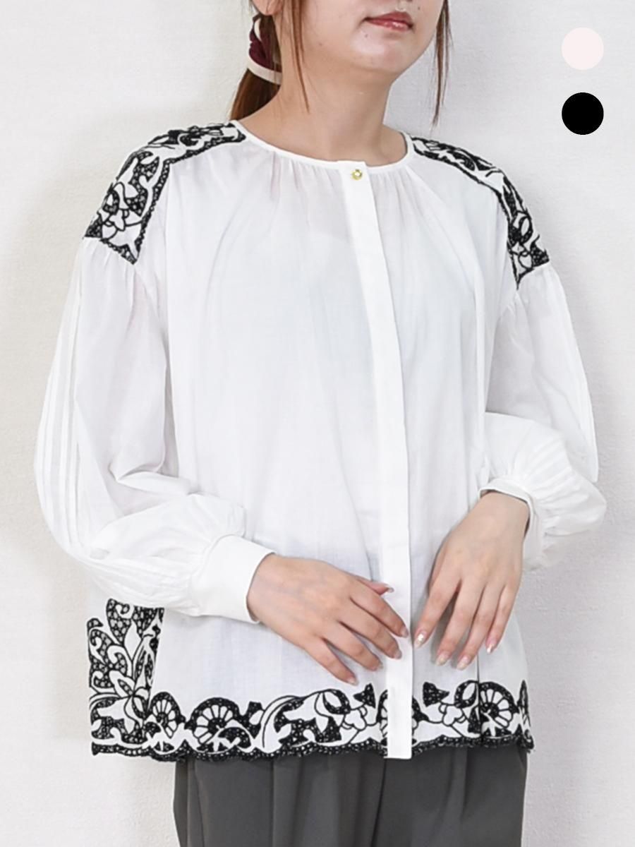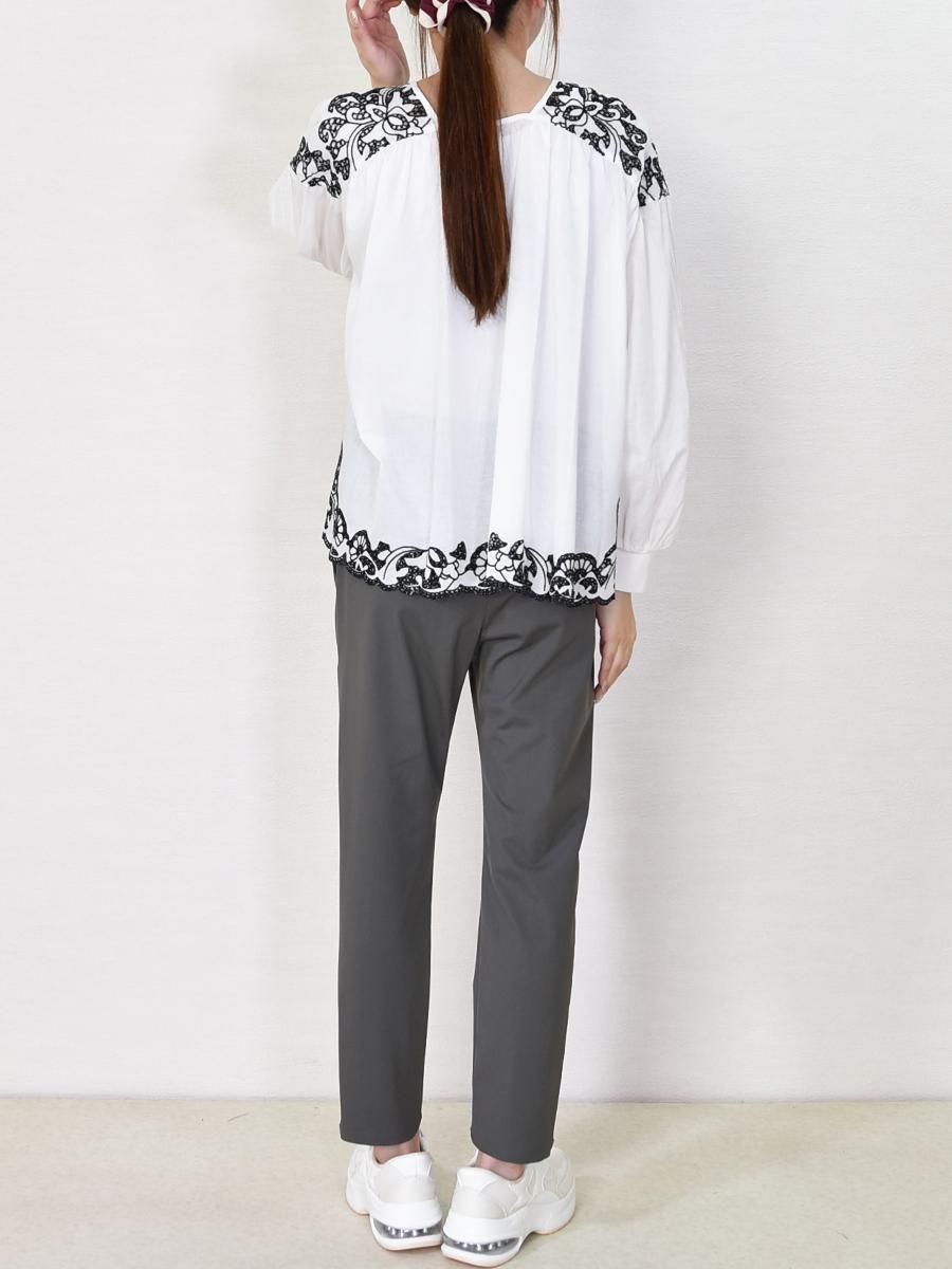 trois(トロワ)の刺繡ギャザーブラウス。さらりとした肌当たりの良いコットン100%のブラウスです。