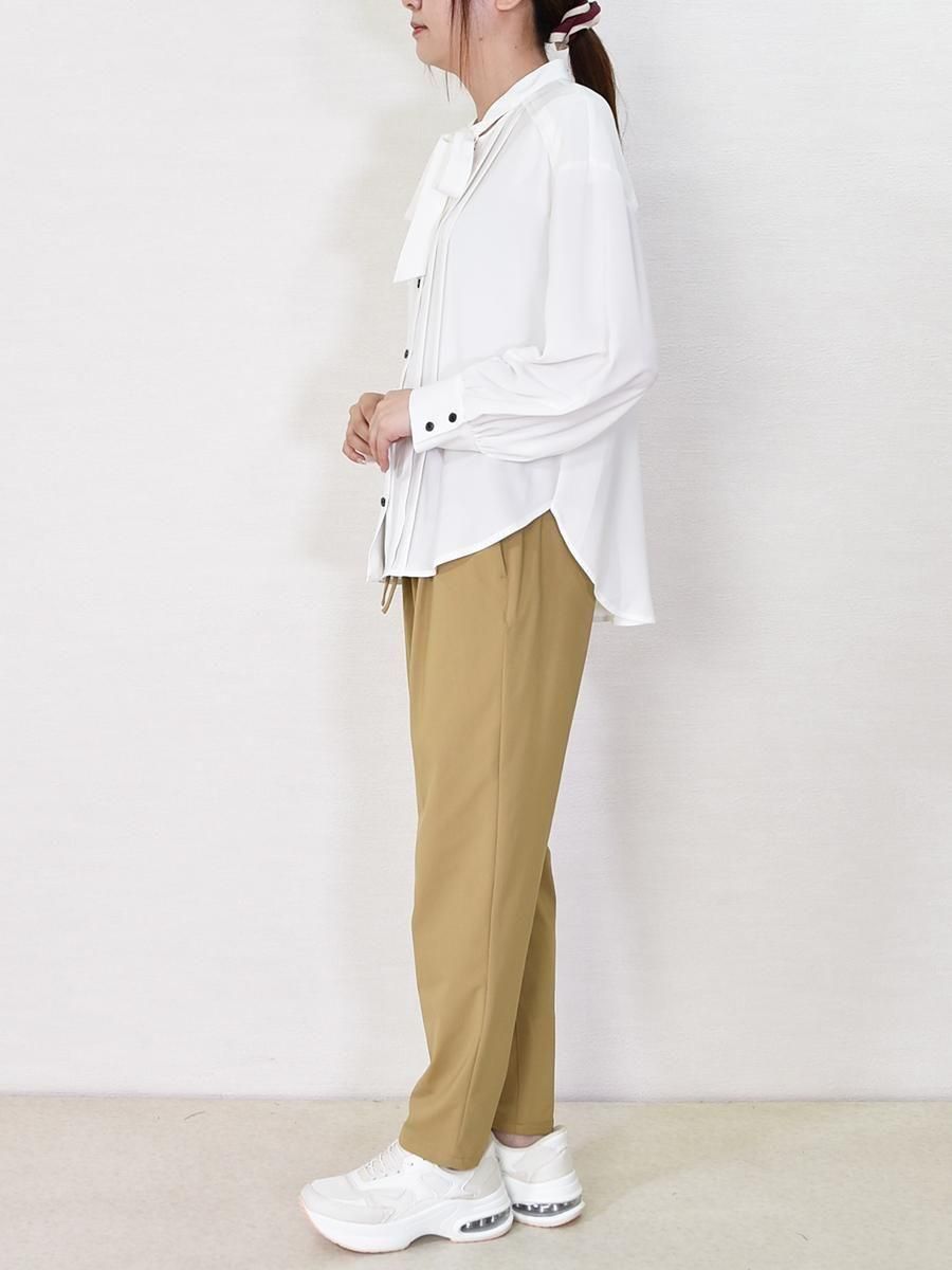 trois(トロワ)のジョーゼットボウタイブラウス。ソフトな肌触りと軽くしなやかなストレッチ性が心地良いジョーゼット素材です。