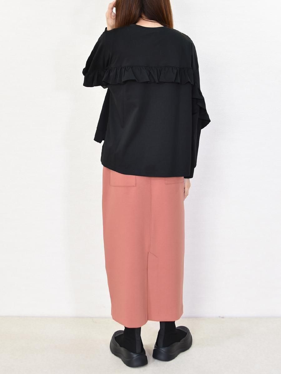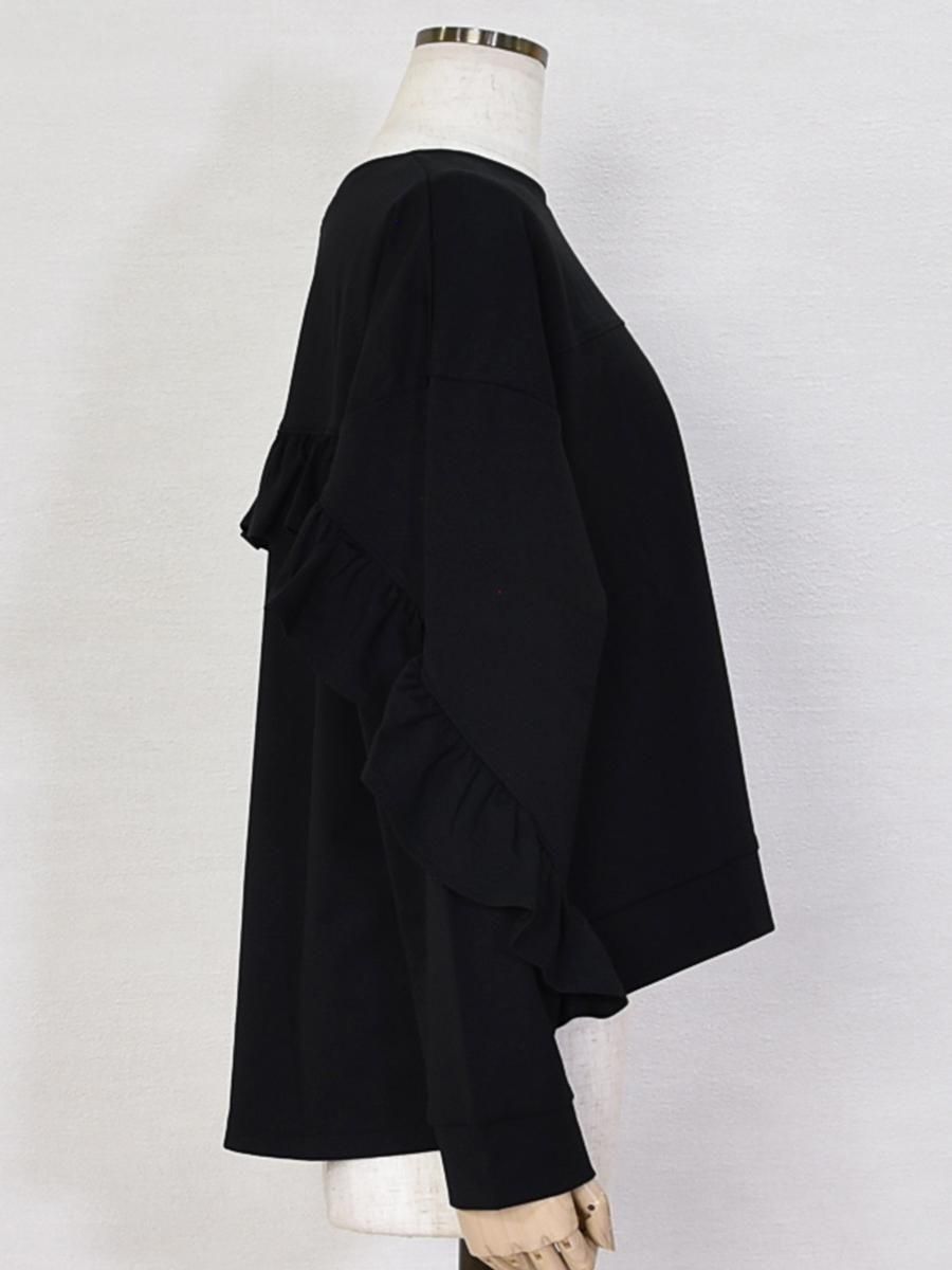 trois(トロワ)のバックフリルプルオーバー。通気性・速乾性が高く、柔らかな肌触りのポンチ生地です。