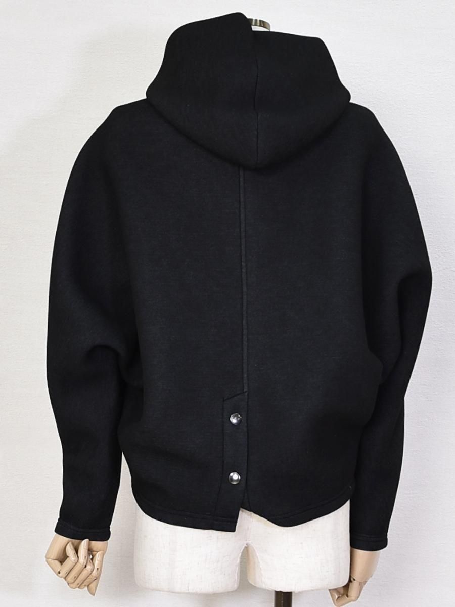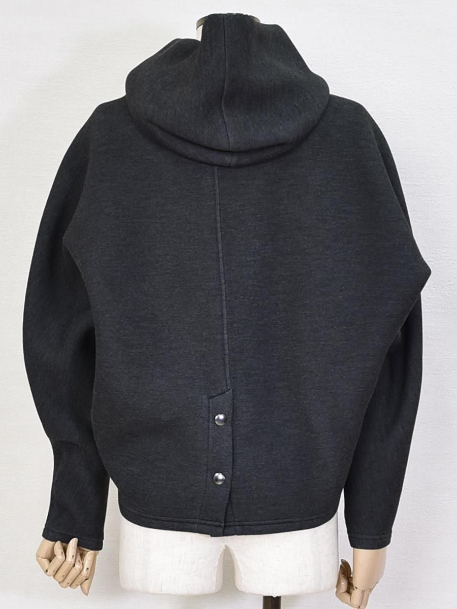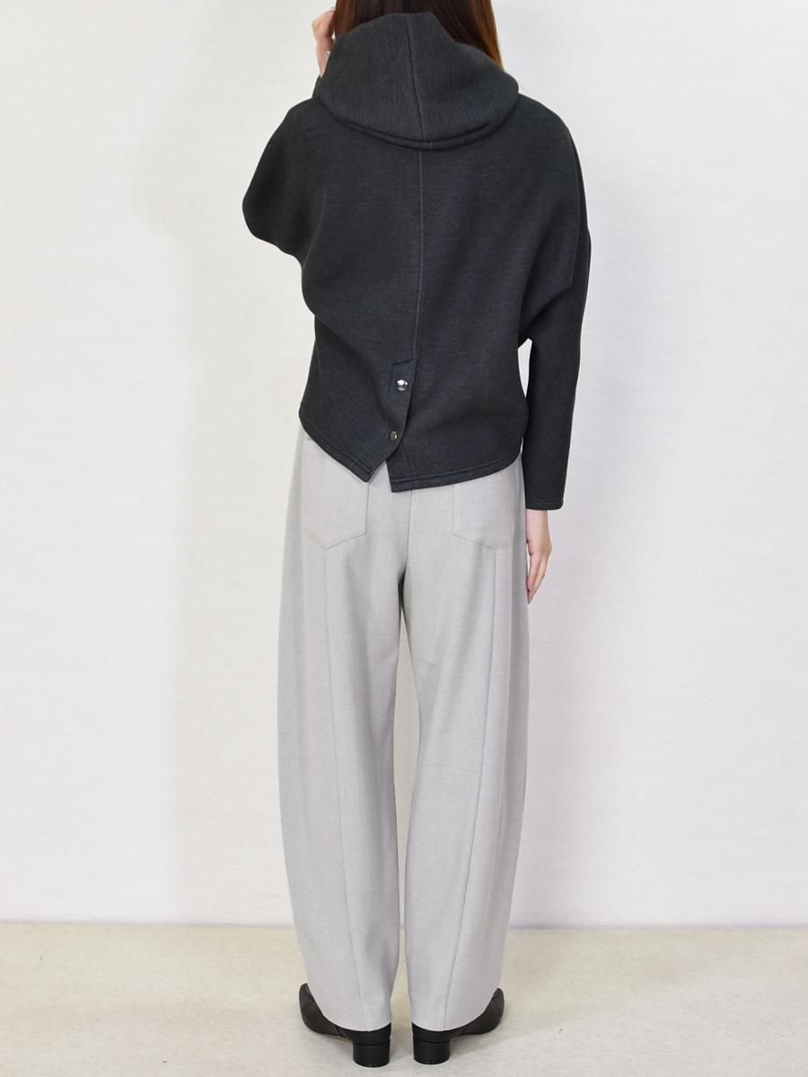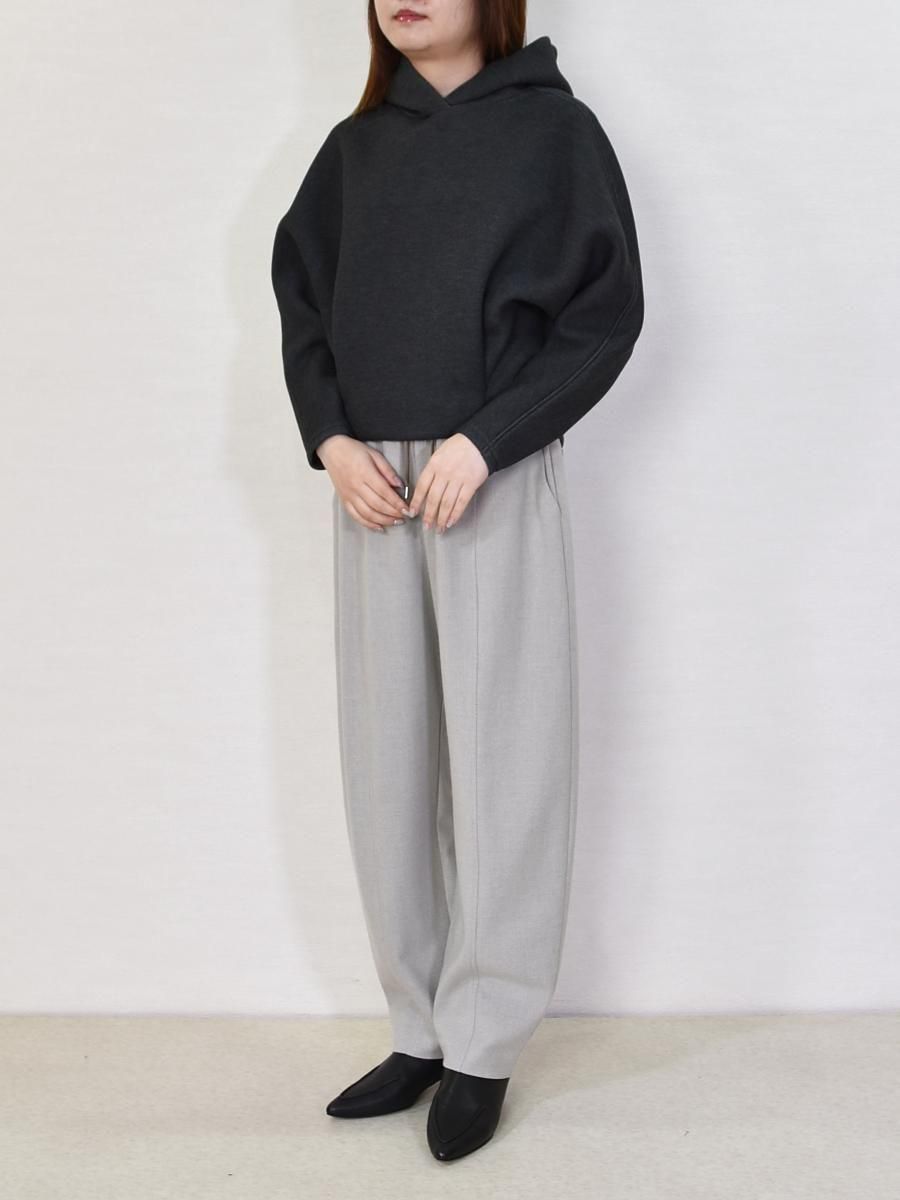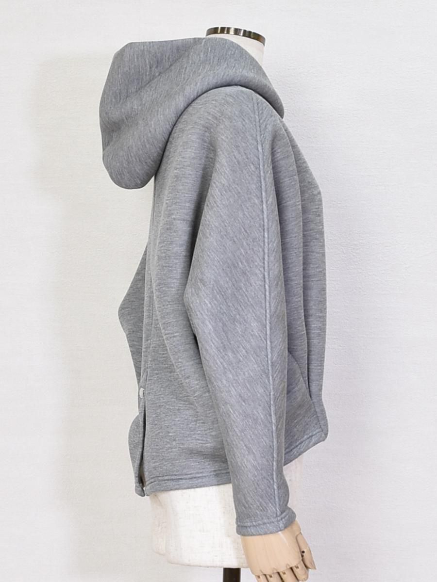 立体的なフードと丸みのあるコクーンシルエットが女性らしい抜け感を演出します。